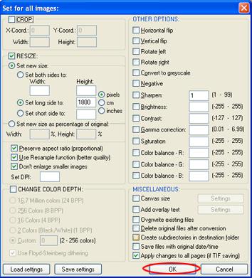 Copy the settings in the picture at the right on the screen. These settings set the longer side of every picture to 1800 pixels in length. Because we clicked "Preserve Aspect Ratio" it will resize the shorter size in proportion with the longer side. After you have copied these settings to your own computer click "OK".