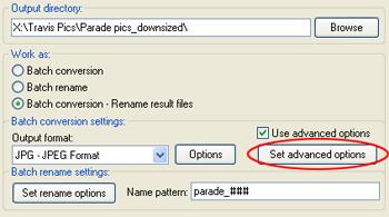 To do this please make your settings the same as the ones in the picture to the right. Do not, however, make your output directory the same. You may also change the "Name Pattern" box to "picturename_###". For example say your pictures were taken at a recent parade. You would then want to enter something like "parade_###". After you have entered each of these settings correctly select "Set advanced options".